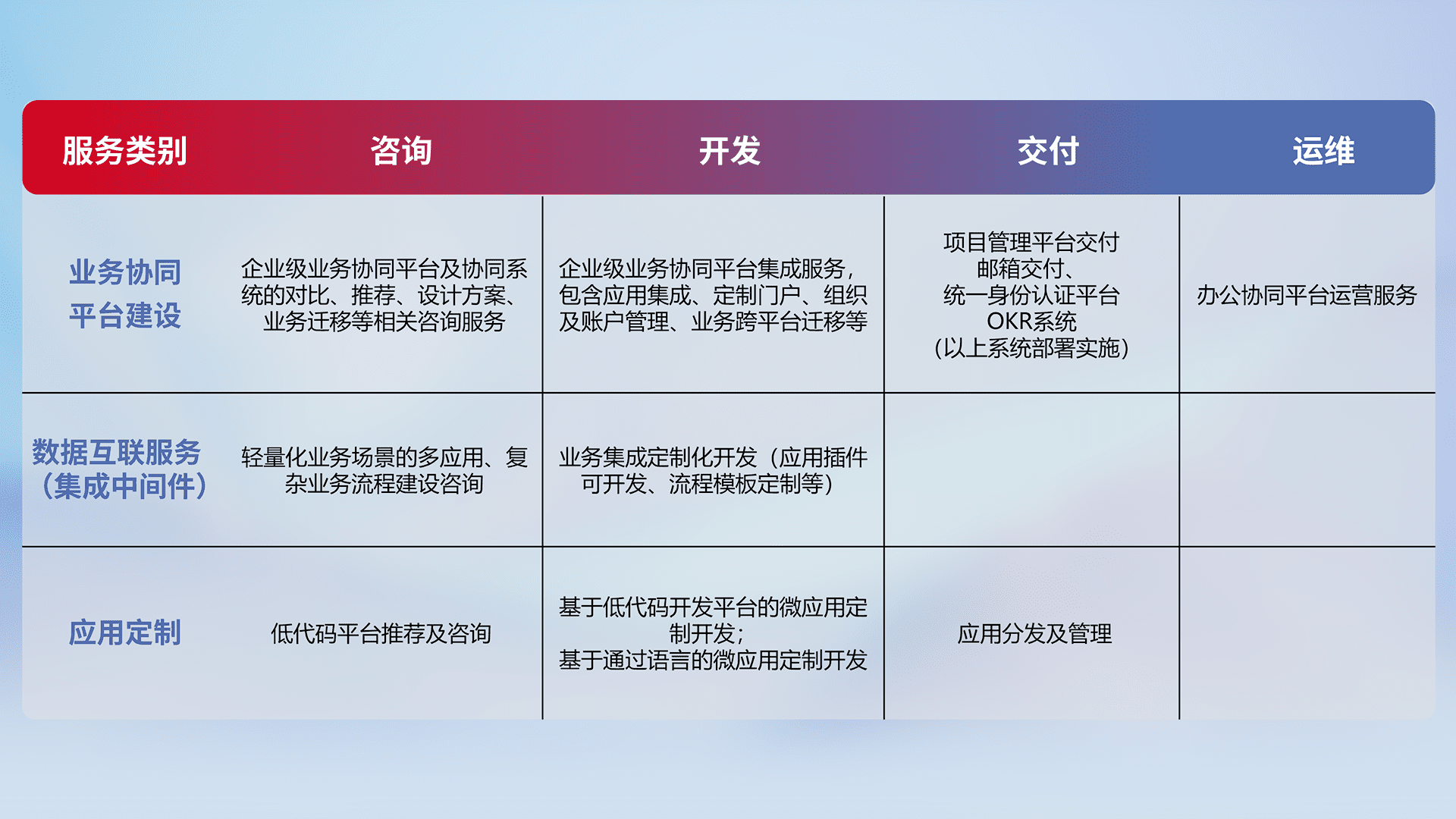 针对钉钉、、、企微、、IDaas等平台级产品提供产品的规划、、、方案、、、、交付、、、、定制化开发等服务,,实现如统一协同办公、、智能客户服务、、、混合会议管理、、、、智能数据查询、、、、等业务场景,,,实现数字化转型。。